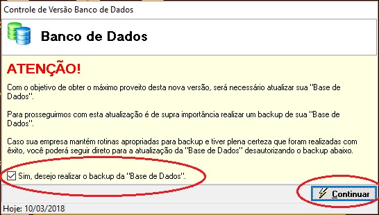 A opção de fazer backup do Banco de Dados antes da atualização já vem marcada por padrão, esse backup pode demorar um pouco. Sendo assim, se você já faz backup regularmente de sua base de dados, poderá desmarcar a opção de fazer backup e pedir para continuar clicando no botão "Continuar".