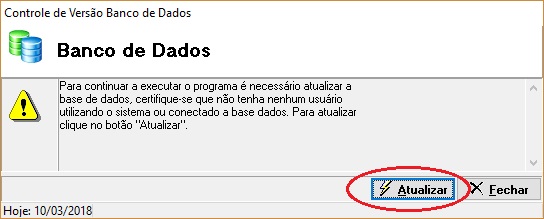 Para finalizar a atualização, entre em cada um dos sistemas, pois imediatamente após entrar com seu usuário e senha, caso houver atualizações no banco de dados, o programa irá lhe avisar através de uma mensagem conforme imagem abaixo: