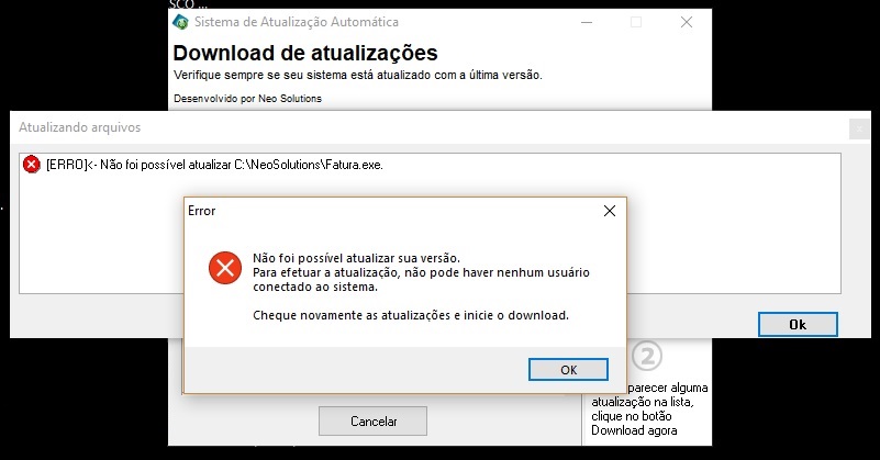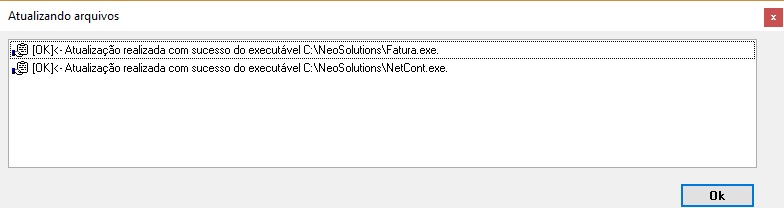 - a) Não ter usuários dos sistemas da Neo Solutions ( Neo Fatura, Net Contábil, Neo Protocolo Free, Palm ) logados. Sendo assim, solicite a todos que saiam de seus respectivos sistemas. Dessa forma todos irão liberar os executáveis para serem atualizados.